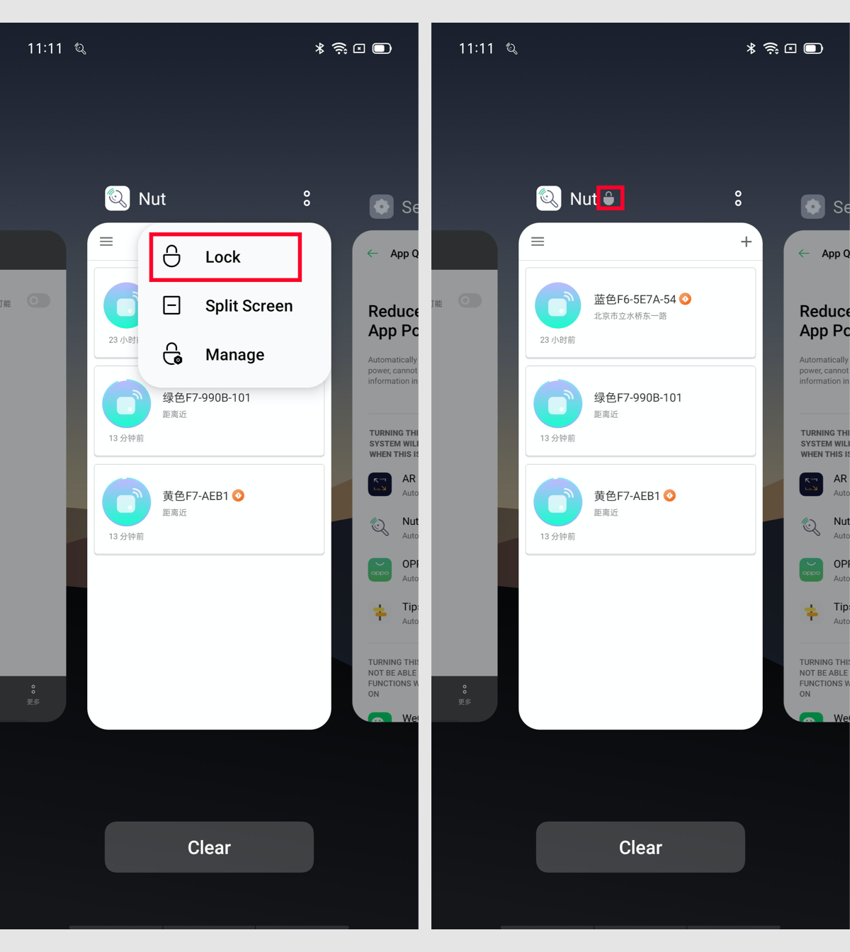 3.Swipe up on the home screen to enter the "Multitasking interface"(or Click to "Task button" at the bottom left of the Home screen) --> Find "Nut" in the app list – Click on the upper right corner and click on "Lock" --> The "lock" flag appears in the upper right corner to indicate that the setting is successful.