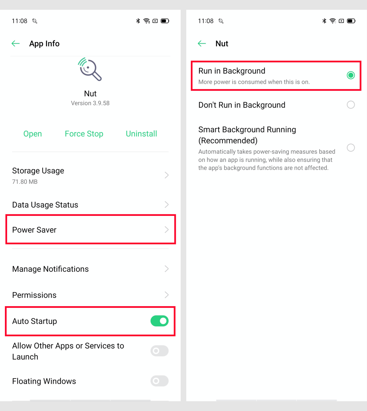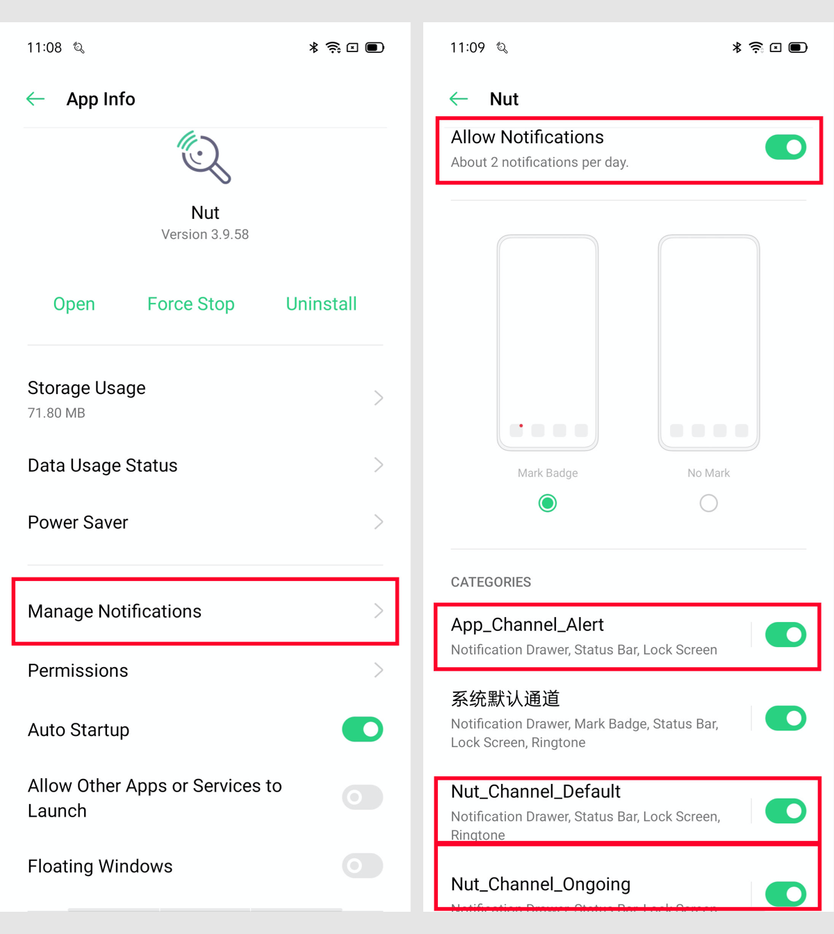 1.Go to the System "Settings" --> Scroll down to "App Management" and click --> Click "App List" --> Find the "Nut" app in the list and click --> Enable "Auto Startup" --> Click "Power Saver" --> Enable " Run in Background"; Click "Manage Notifications" --> Enable "Allow notifications"; Click "AppChannelAlert" --> Only enable " Allow notifications"; Click "NutChannelDefault" --> Enable "Allow notifications" "Ringtone" "Vibration" etc.; Click "NutChannelOngoing" --> Only enable " Allow notifications".